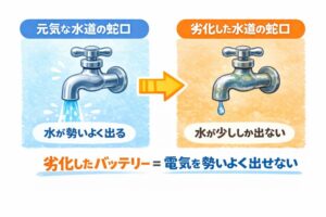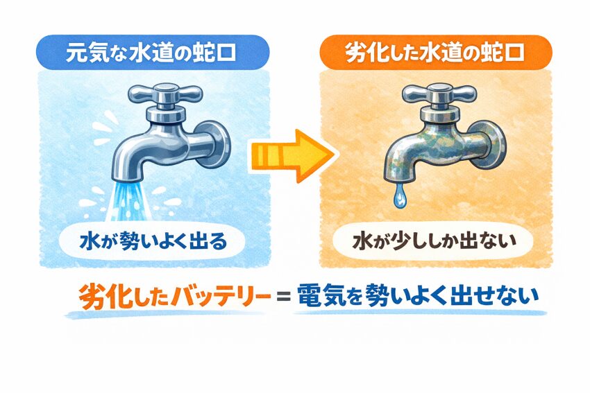 元気な蛇口(正常なバッテリー)では水(電気)を勢いよく出すことができません。