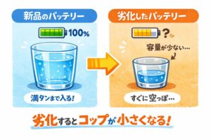 小さなコップ(劣化したバッテリー)では、中の水(電池残量)がすぐ無くなってしまいます。