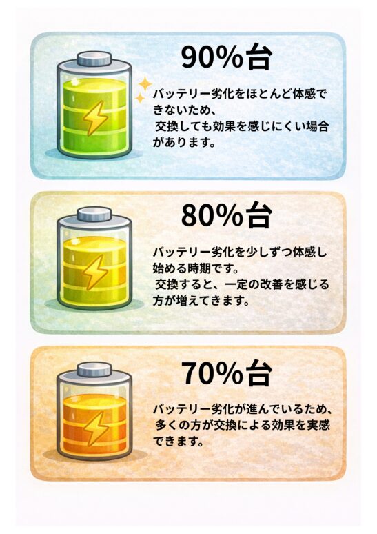 最大容量が80%台の場合、バッテリー交換を視野に入れ始める人が多いです。