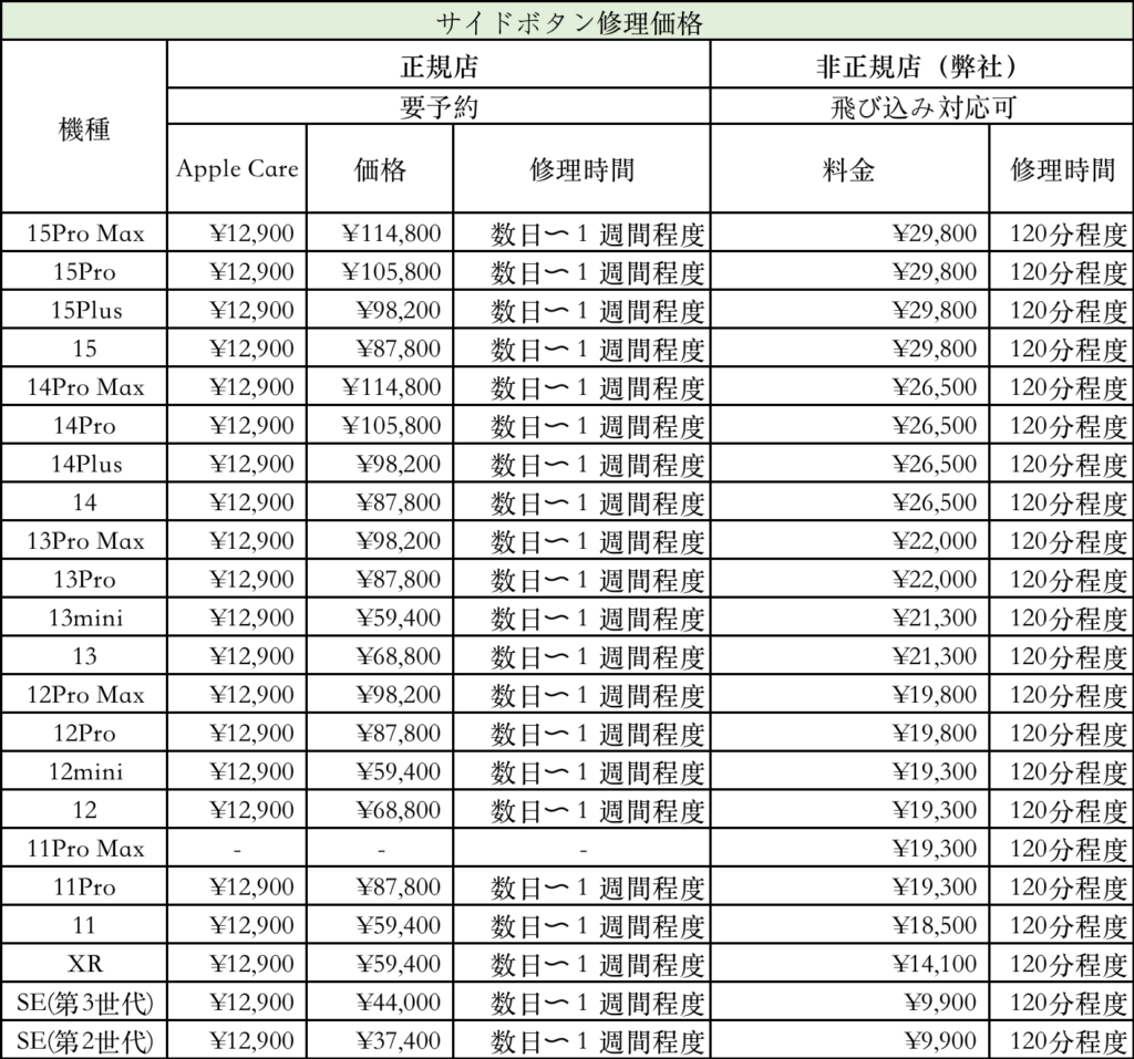<サイドボタン修理価格・時間の機種別比較表>