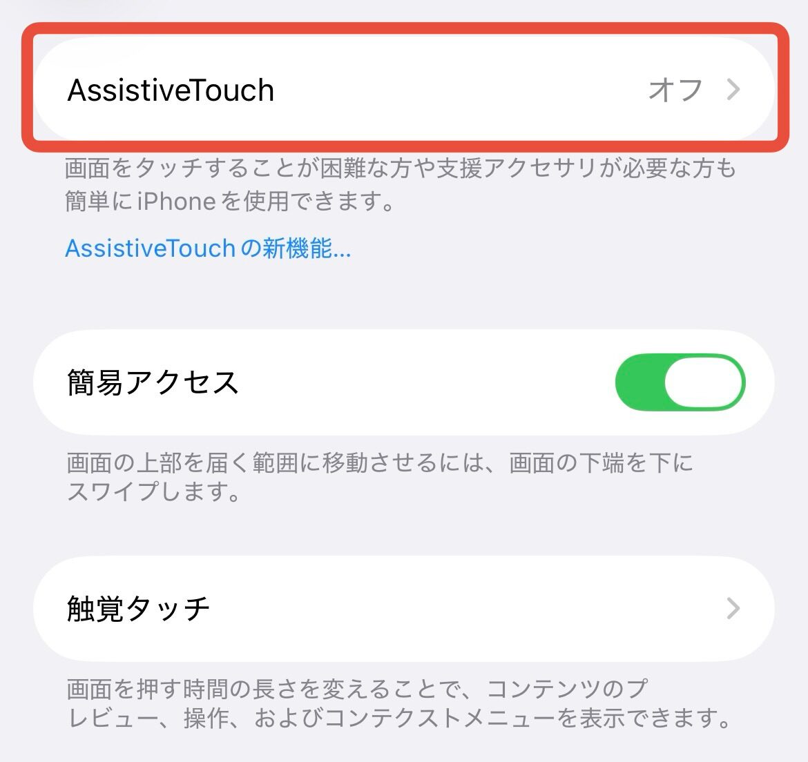 「設定」→「アクセシビリティ」→「タッチ」→「AssistiveTouch」の順に選択し、「AssistiveTouch」をオンにします。